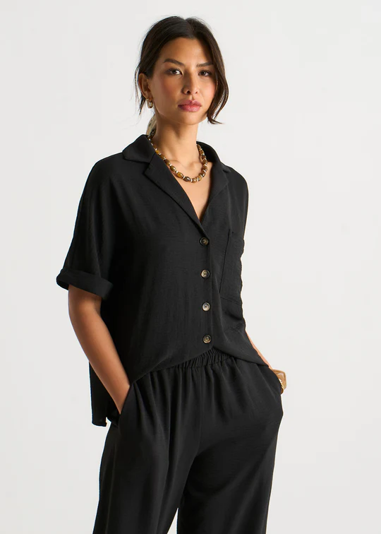 Effortless style meets breathable comfort in this oversized shirt top. Cut from lightweight, air-flow fabric, it's designed to move with you—perfect for layering or wearing solo. The relaxed silhouette delivers that coveted laid-back vibe without compromising on edge. Effortless elegance meets everyday comfort in these black wide-leg trousers. The elastic waist delivers a relaxed fit that moves with you, while the generous leg silhouette creates a bold, modern shape. Perfect for dressing up or down, they're a versatile wardrobe essential that feels as good as it looks.