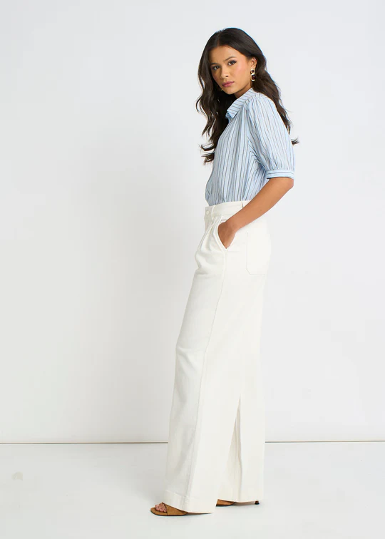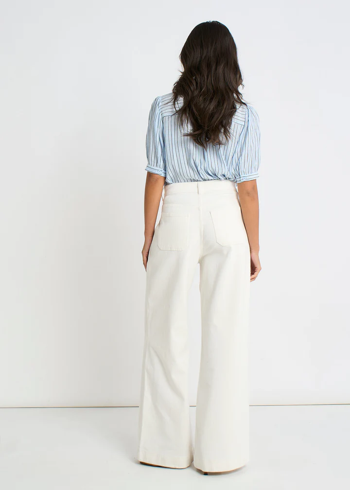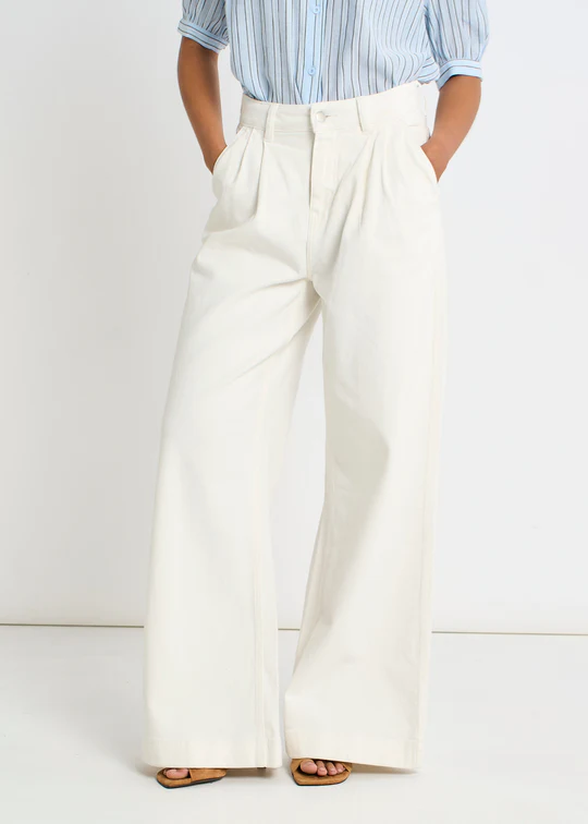 Off-white wide-leg jeans with sharp front pleats for a modern, tailored silhouette. The relaxed fit through the hip and thigh offers comfort without compromise, while the crisp pleating adds structure and edge. A versatile wardrobe essential that pairs effortlessly with everything from oversized tops to fitted knits. Dress them up or down these jeans work as hard as you do.