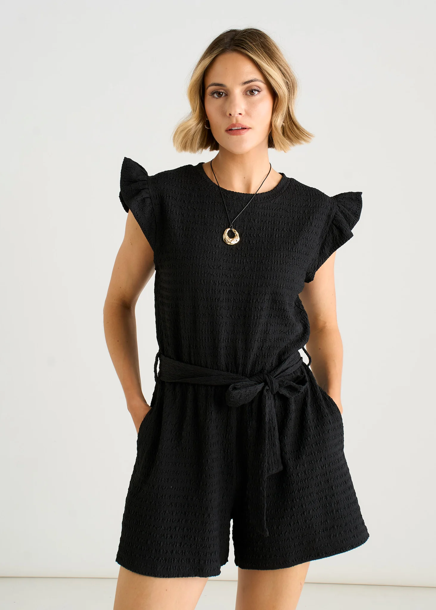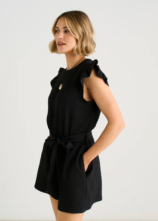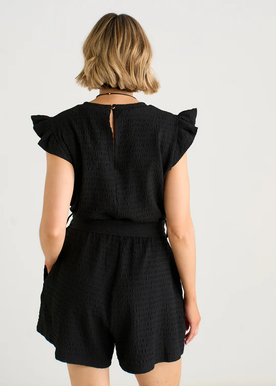 Playful and effortless, this black playsuit combines stretch texture with a flattering elasticated waist for all-day comfort. The signature frill detail adds movement and personality to a versatile piece that works from day to night. Crafted for real bodies and real life, it's the kind of piece you'll reach for again and again.
